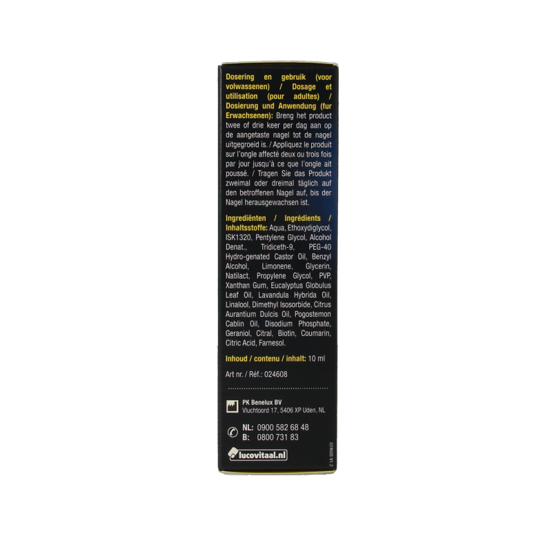 Lucovitaal® Kalknagel Behandeling vloeistof is bedoeld voor uitwendig gebruik. Breng het product 2 of 3 keer per dag (bijvoorbeeld ’s ochtends en ’s avonds) op het aangetaste gebied tot de kalknagel volledig is uitgegroeid.