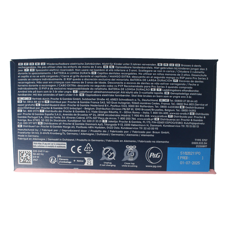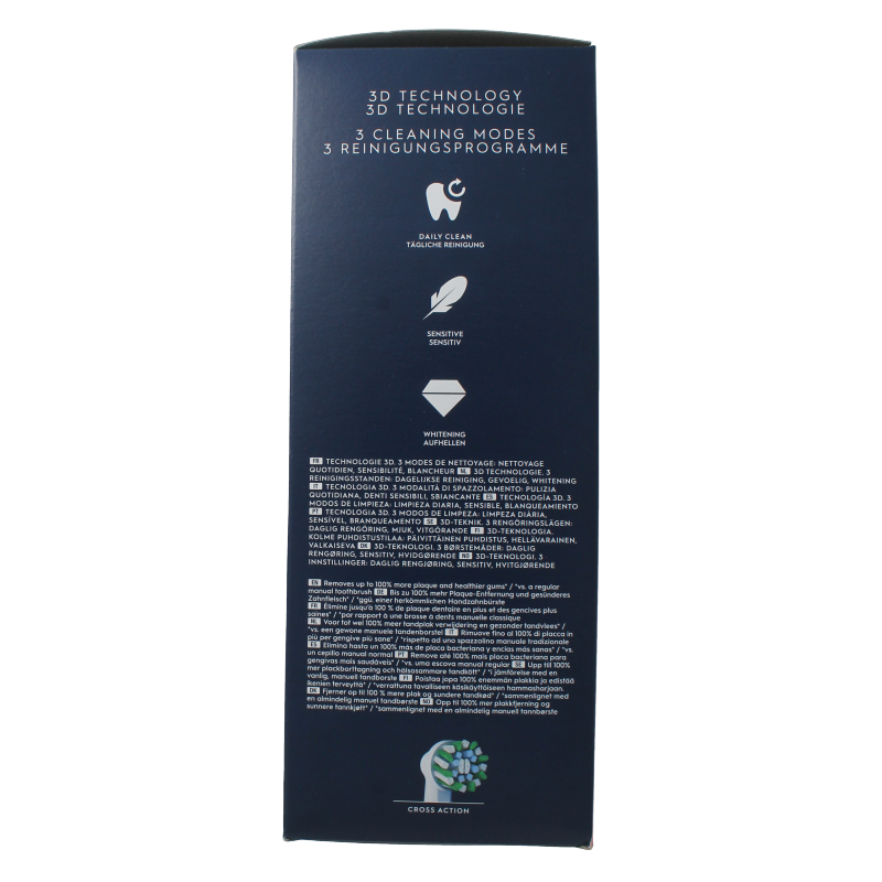 Ervaar de Oral-B Pro Series 3 van het nummer één meest gebruikte tandenborstelmerk door tandartsen wereldwijd. De Pro Series 3 elektrische tandenborstel helpt u te poetsen zoals uw tandarts dat aanbeveelt: Het helpt u 2 minuten poetsen met de professionele timer en meldt u om de 30 seconden dat u een andere zone moet poetsen. U beweegt de borstel gewoon in uw mond en de unieke, ronde borstelkop van Oral-B doet de rest. Hij verwijdert tot 100% meer tandplak dan een gewone manuele tandenborstel voor gezonder tandvlees en maakt uw glimlach witter vanaf de eerste poetsdag door oppervlakkige verkleuringen te verwijderen. Dat is niet alles, de tandenborstel helpt u ook uw gevoelige tandvlees te beschermen met de 360 ̊ poetsdrukcontrole die de poetssnelheid vermindert en u waarschuwt als u te hard poetst. De Oral-B Pro Series 3 tandenborstel is onmisbaar voor iedereen die naar een elektrische tandenborstel wil overschakelen en zijn mondgezondheid wil verbeteren.