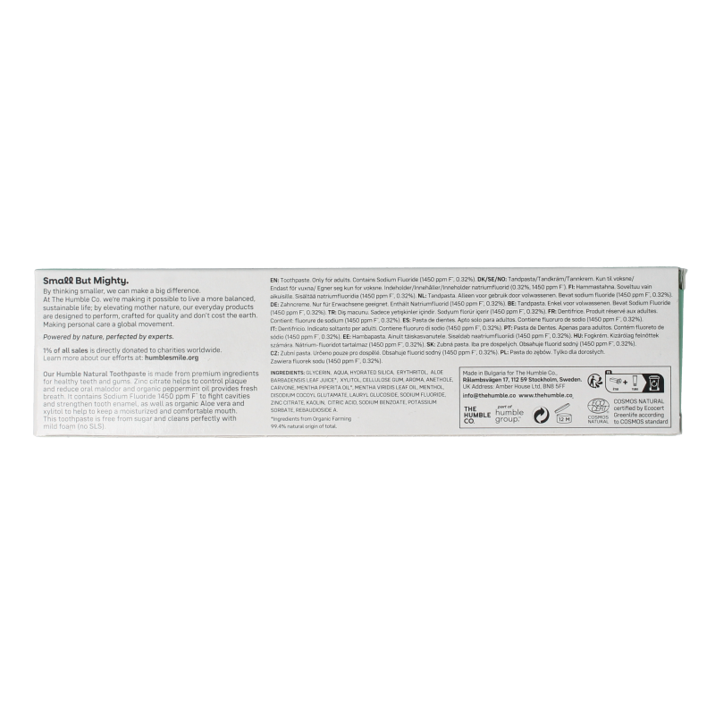 Glycerin, Aqua, Hydrated Silica, Erythritol, Aloe Barbadensis Leaf Juice*, Xylitol, Cellulose Gum, Aroma, Anethole, Carvone, Mentha Piperita Oil*, Mentha Viridis Leaf Oil, Menthol, Disodium Cocoyl Glutamate, Lauryl Glucoside, Sodium Fluoride, Zinc Citrate, Kaolin, Citric Acid, Sodium Benzoate, Potassium Sorbate, Rebaudioside A.