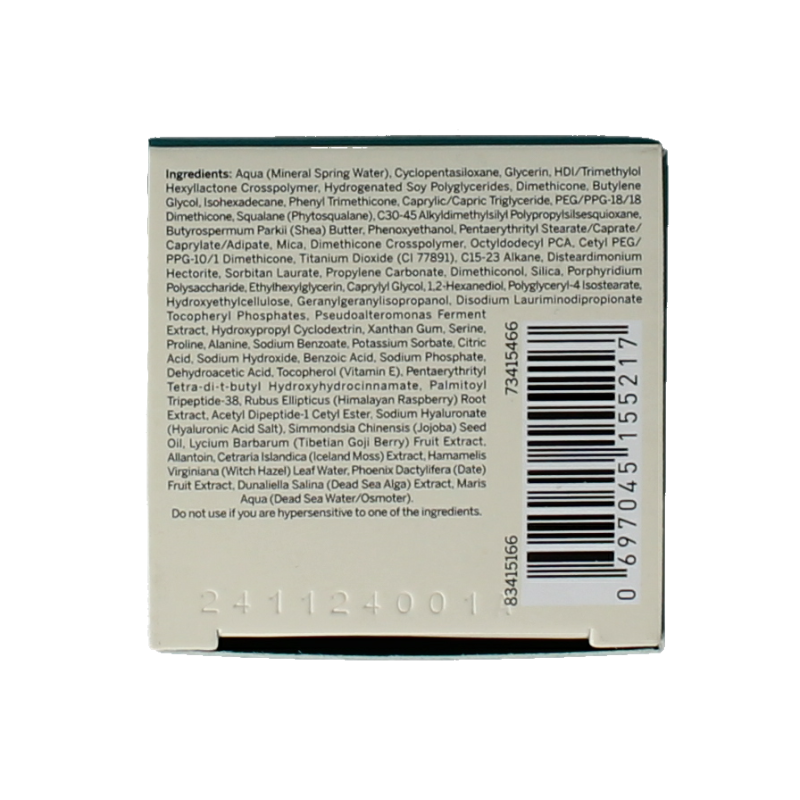 Aqua, Cyclopentasiloxane, Glycerin, Hdi/Trimethylol Hexyllactone Crosspolymer, Hydrogenated Soy Polyglycerides, Dimethicone, Butylene Glycol, Isohexadecane, Phenyl Trimethicone, Caprylic/Capric Triglyceride, Peg/Ppg-18/18 Dimethicone, Squalane, C30-45 Alkyl Dimethylsilyl Polypropylsilsesquioxane, Butyrospermum Parkii, Phenoxyethanol, Pentaerythrityl Stearate/Caprate/Caprylate/Adipate, Mica, Dimethicone Crosspolymer, Octyldodecyl Pca, Cetyl Peg/Ppg-10/1 Dimethicone, Titanium Dioxide, C15-23 Alkane, Disteardimonium Hectorite, Sorbitan Laurate, Propylene Carbonate, Dimethiconol, Silica, Hydroxyethylcellulose, Geranylgeranyl Isopropanol, Disodium Lauriminodipropionate Tocopheryl Phosphates, Pseudoalteromonas Ferment Extract, Hydroxypropyl Cyclodextrin, Xanthan Gum, Serine, Proline, Alanine, Sodium Benzoate, Potassium Sorbate, Citric Acid, Sodium Hydroxide, Benzoic Acid, Sodium Phosphate, Edta, Tocopherol, Pentaerythrityl Tetra-Di-T-Butyl Hydroxyhydrocinnamate, Palmitoyl Tripeptide-38, Rubus Ellipticus Root Extract, Acetyl Dipeptide-1 Cetyl Ester, Sodium Hyaluronate, Simmondsia Chinensis Seed Oil, Lycium Barbarum Fruit Extract, Allantoin, Cetraria Islandica Extract, Hamamelis Virginiana Leaf Water, Phoenix Dactylifera Fruit Extract, Dunaliella Salina Extract, Maris Aqua
