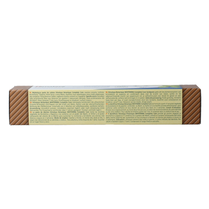De Himalaya Botanique kruidentandpasta’s bevatten biologische ingrediënten. Witmakende kracht met een smaaksensatie van pepermunt. De Whitening Compleet Care Pepermunt Tandpasta bevat plantenzymen van Bromelaïne en Papaïne voor wittere tanden, gecombineerd met de kracht van Neem kruid, Xylitol en de verfrissende smaak van Pepermunt blad. Helpt tandsteen en ontstoken tandvlees voorkomen. Dit geeft je een zelfverzekerde glimlach!