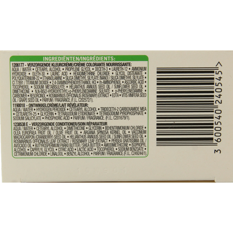 Aqua / Water, Cetearyl Alcohol, Propylene Glycol, Deceth-3, Laureth-12, Ammonium Hydroxide, Oleth-30, Lauric Acid, Hexadimethrine Chloride, Glycol Distearate, Polyquaternium-22, Ethanolamine, Silica Dimethyl Silylate [Nano] / Silica Dimethyl Silylate, CI 77891 / Titanium Dioxide, 2,4-Diaminophenoxyethanol HCI, m-Aminophenol, Ascorbic Acid, Tocopherol, Sodium Metabisulfite, Helianthus Annuus Seed Oil / Sunflower Seed Oil, Dimethicone, N,N-BIS(2-Hydroxyethyl)-p-Phenylenediamine Sulfate, p-Phenylenediamine, Carbomer, Resorcinol, Rosmarinus Officinalis (Rosemary) Extract, EDTA, Vitis Vinifera Seed Oil / Grape Seed Oil, Parfum / Fragrance (F.I.L. C202572/1).