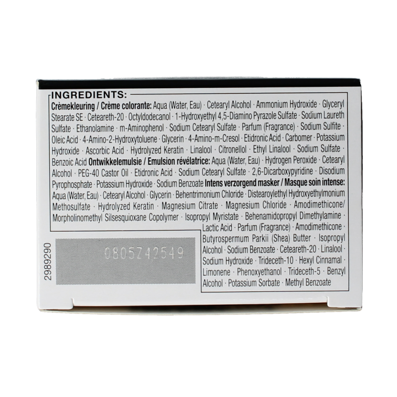 Aqua (Water, Eau), Cetearyl Alcohol, Ammonium Hydroxide, Glyceryl Stearate SE, Ceteareth-20, Octyldodecanol, 1-Hydroxyethyl 4,5-Diamino Pyrazole Sulfate, Sodium Laureth Sulfate, Ethanolamine, m-Aminophenol, Sodium Cetearyl Sulfate, Parfum (Fragrance), Sodium Sulfite, Oleic Acid, 4-Amino-2-Hydroxytoluene, Glycerin, 4-Amino-m-Cresol, Etidronic Acid, Carbomer, Potassium Hydroxide, Ascorbic Acid, Hydrolyzed Keratin, Linalool, Citronellol, Ethyl Linalool, Sodium Sulfate, Benzoic Acid