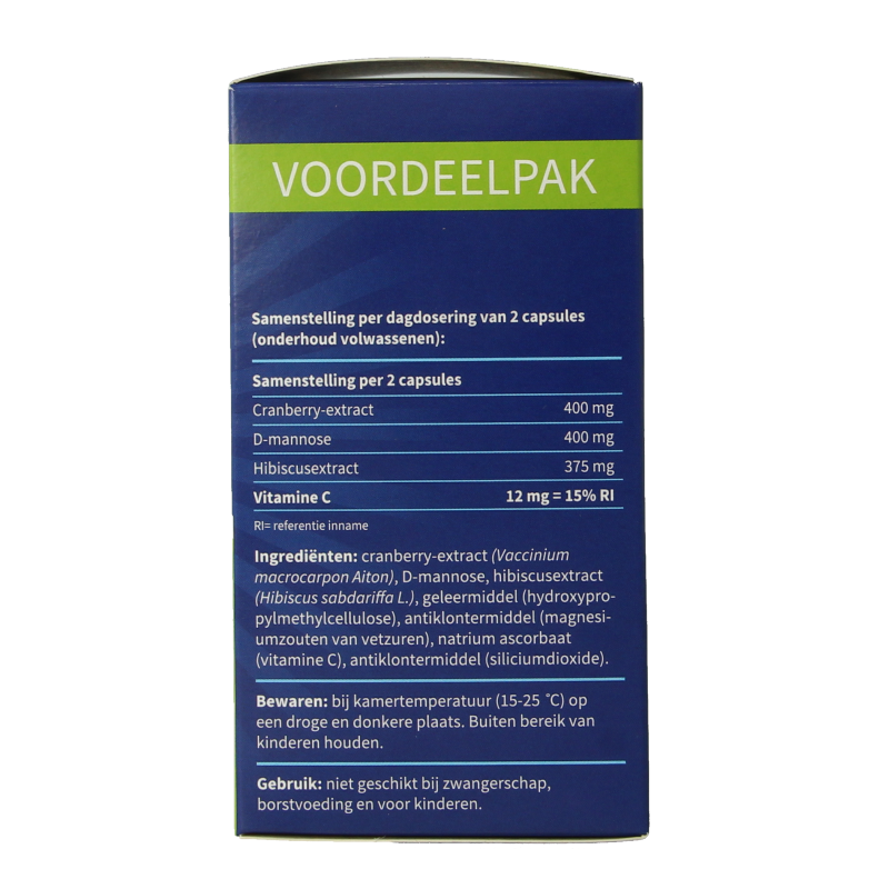 Cranberry-extract (Vaccinium macrocarpon Aiton), D-mannose, hibiscusextract (Hibiscus sabdariffa L.), geleermiddel (hydroxypropylmethylcellulose), antiklontermiddel (magnesiumzouten van vetzuren), natrium ascorbaat (vitamine C), antiklontermiddel (siliciumdioxide).