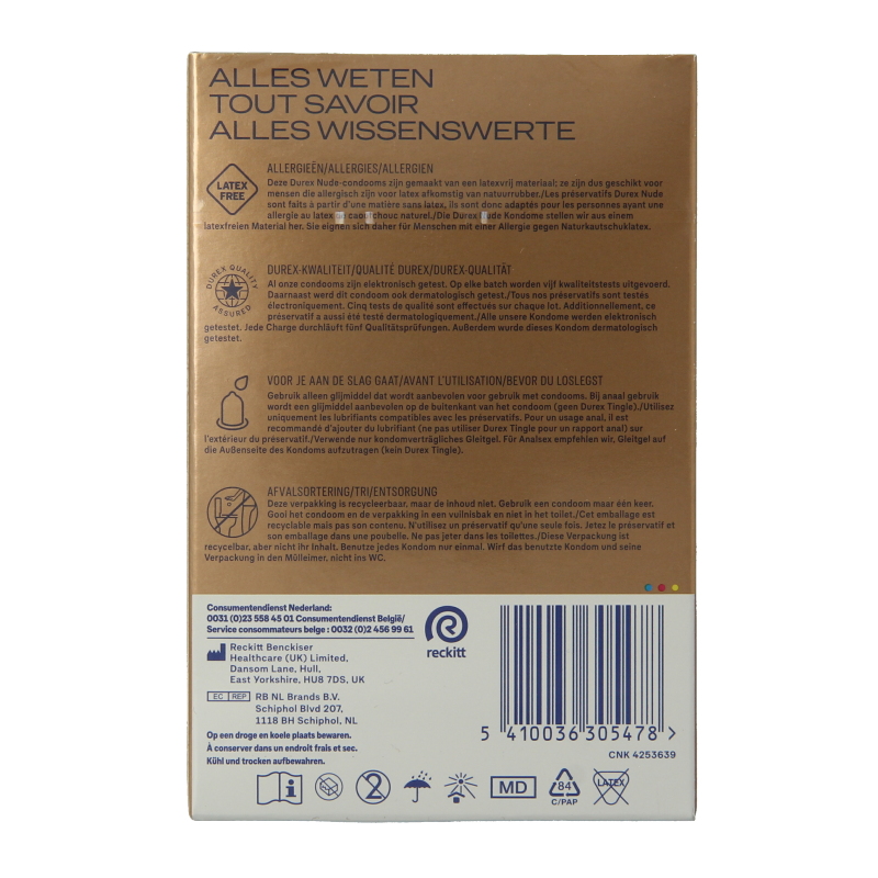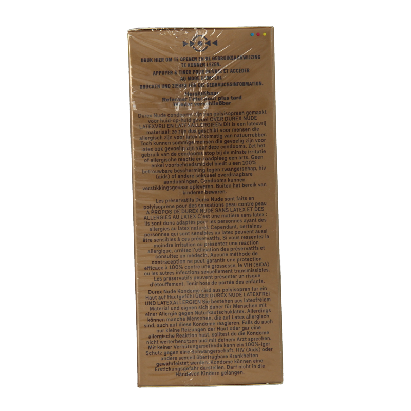 De Durex Nude No Latex condooms zijn gemaakt van polyisopreen om het risico op latexallergieen te minimaliseren en voor een huid-op-huid gevoel. Als u toch irritatie ondervindt of een allergische reactiekrijgt, stop dan het gebruik en raadpleeg een arts.Condooms kunnen verstikkingsgevaar opleveren. Buiten bereik van kinderen bewaren.