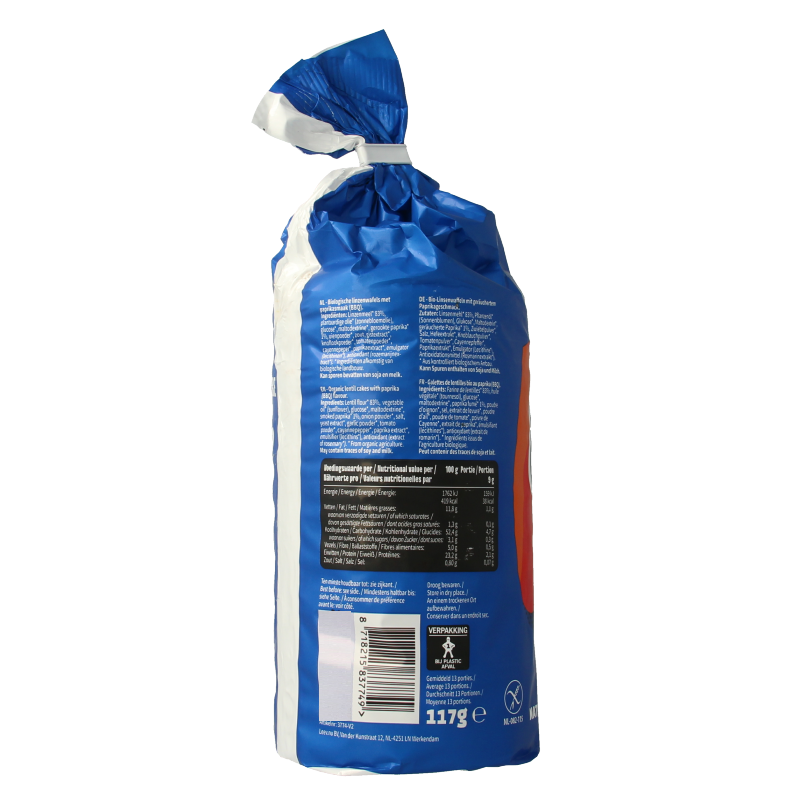 Linzenmeel* 83%, plantaardige olie* (zonnebloemolie), glucose*, maltodextrine*, gerookte paprika*, 1% uienpoeder*, zout, gistextract*, knoflookpoeder*, tomatenpoeder*, cayennepeper*, paprikaextract*, emulgator (lecithinen*), antioxidant*(rozemarijnextract*). *Ingrediënten afkomstig van biologische landbouw.