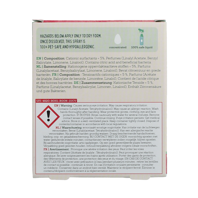 Met 1 miljard poetshulpjes frist deze spray je huisdier in een oogwenk op. Vuil en “nattehondengeur” verdwijnen meteen, terwijl de probiotica nog dagenlang actief blijven om geurtjes verder af te breken en de huidflora te ondersteunen. Een snelle, veilige en stressvrije manier om je hond of kat schoon en fris te houden.